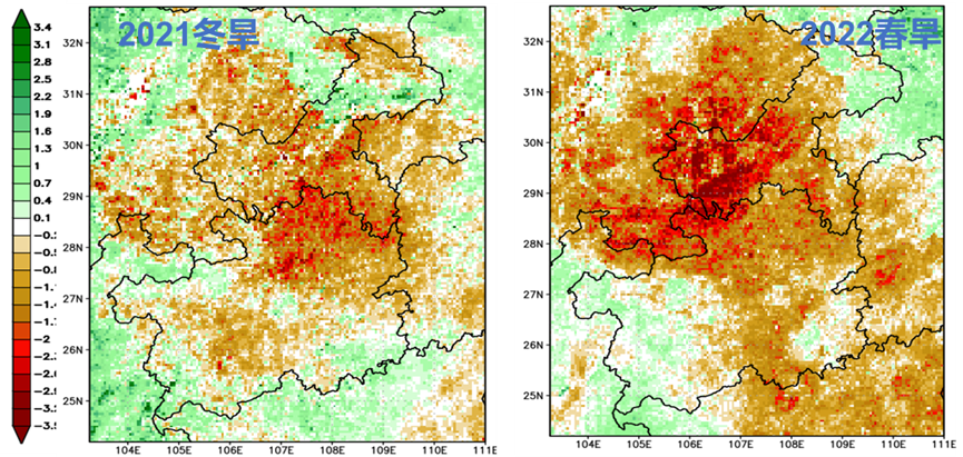 图4 贵州重庆地区2021冬旱(左)和2022春旱(右)的基于风云遥感的干旱指数空间分布图